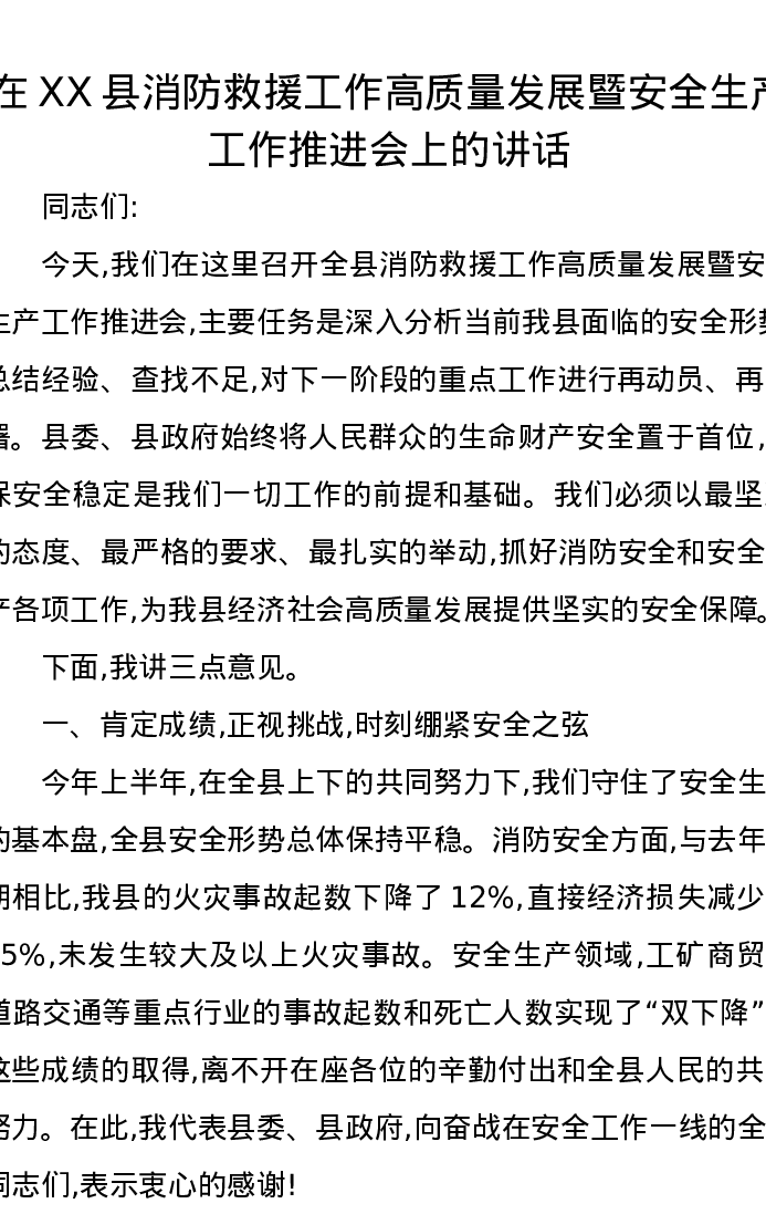 在XX县消防救援工作高质量发展暨安全生产工作推进会上的讲话