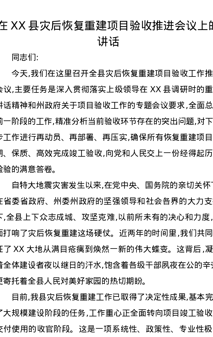 在XX县灾后恢复重建项目验收推进会议上的讲话