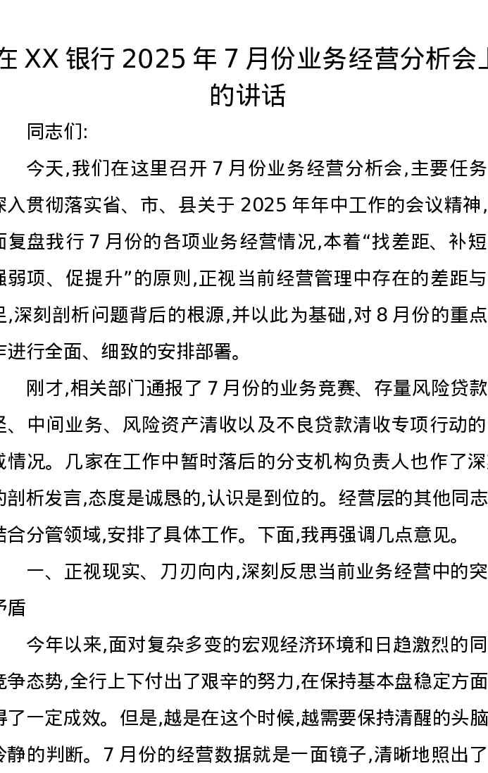 在XX银行2025年7月份业务经营分析会上的讲话