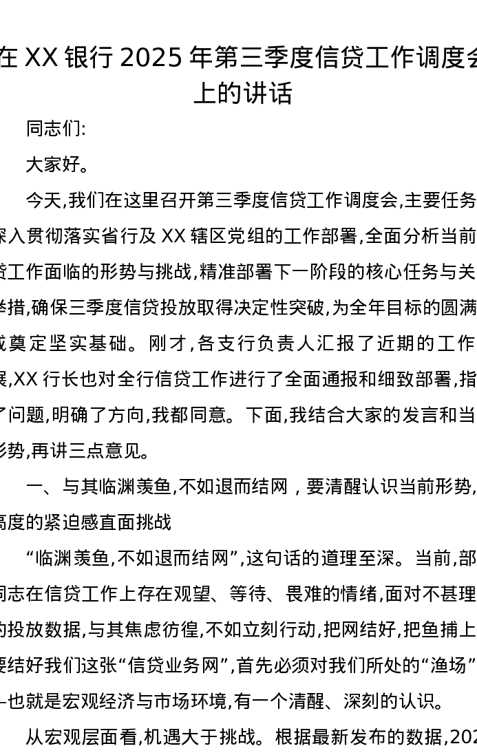 在XX银行2025年第三季度信贷工作调度会上的讲话