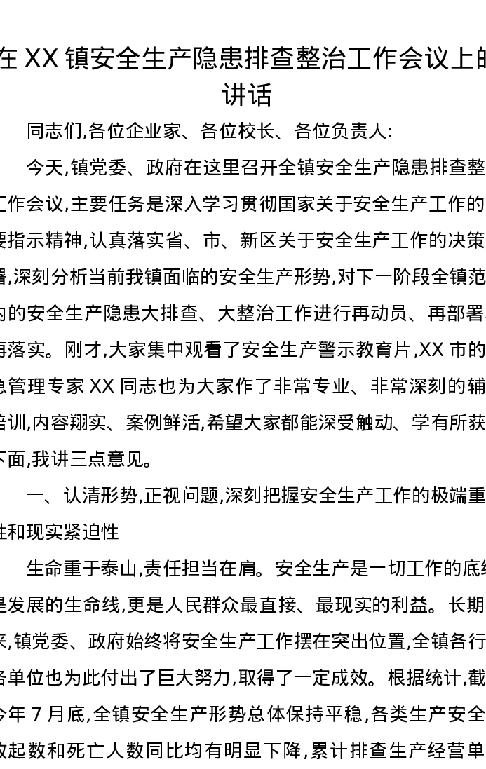 在XX镇安全生产隐患排查整治工作会议上的讲话