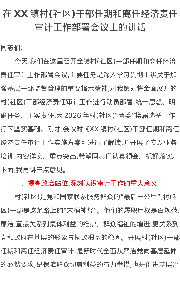 在XX镇村(社区)干部任期和离任经济责任审计工作部署会议上的讲话