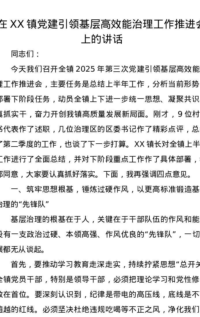 在XX镇党建引领基层高效能治理工作推进会上的讲话