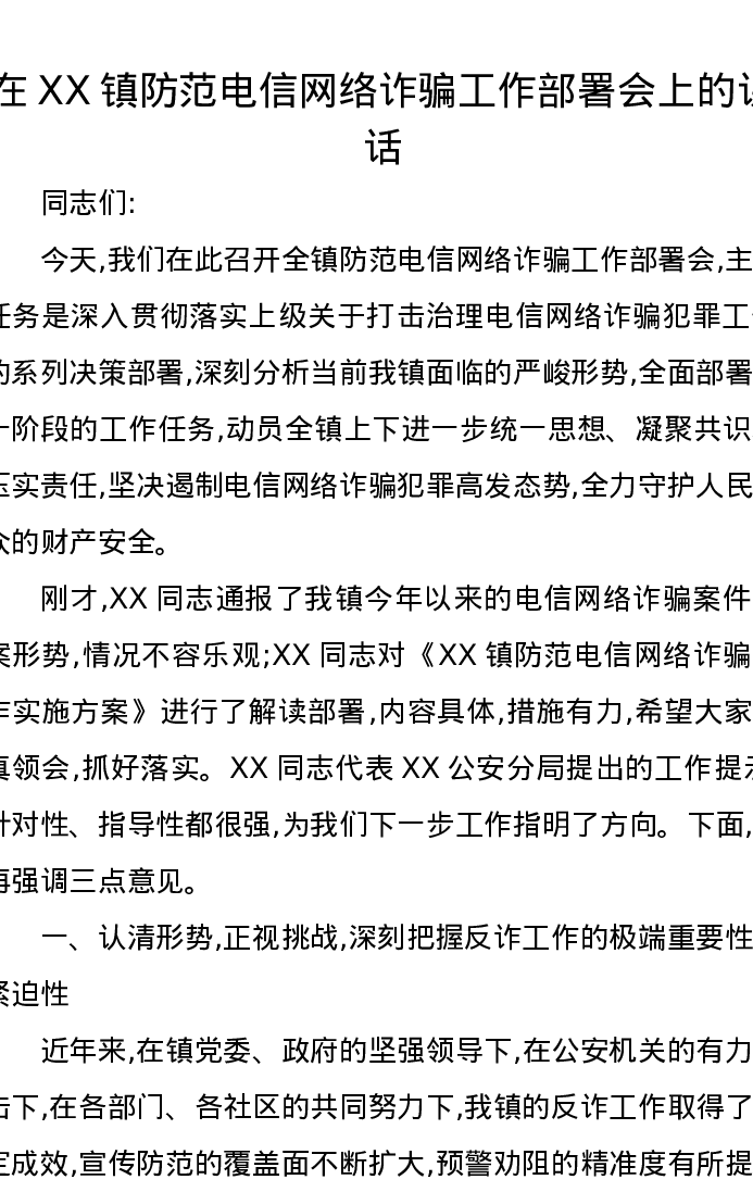 在XX镇防范电信网络诈骗工作部署会上的讲话