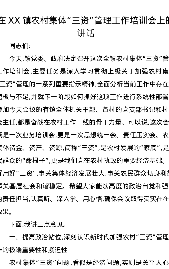 在XX镇农村集体“三资”管理工作培训会上的讲话