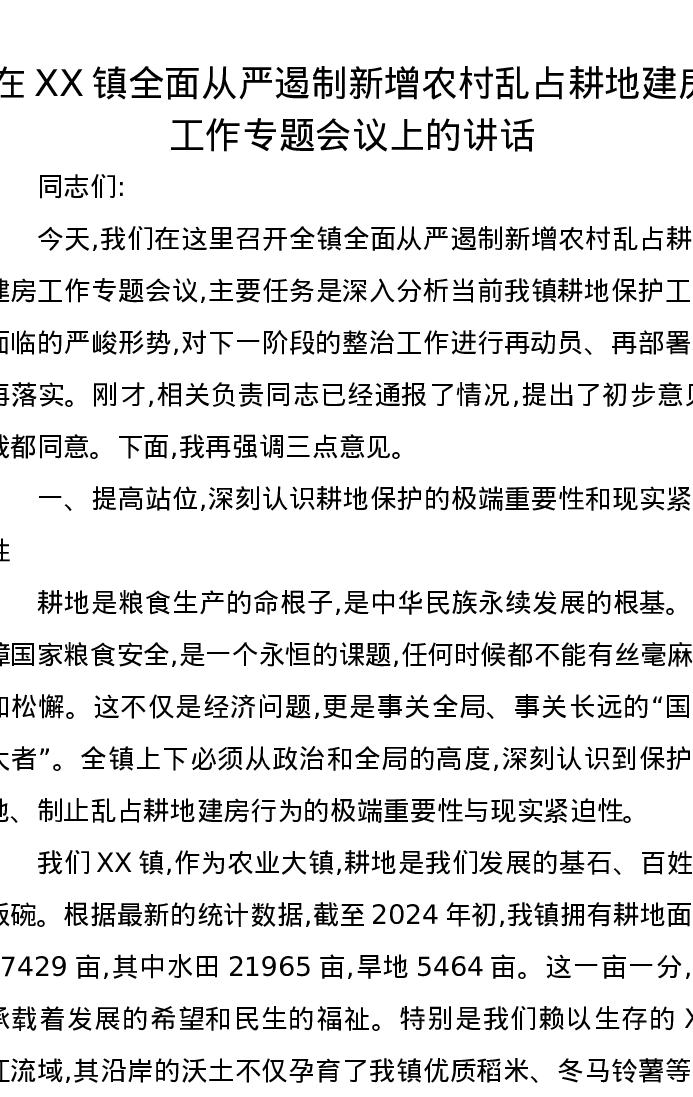 在XX镇全面从严遏制新增农村乱占耕地建房工作专题会议上的讲话