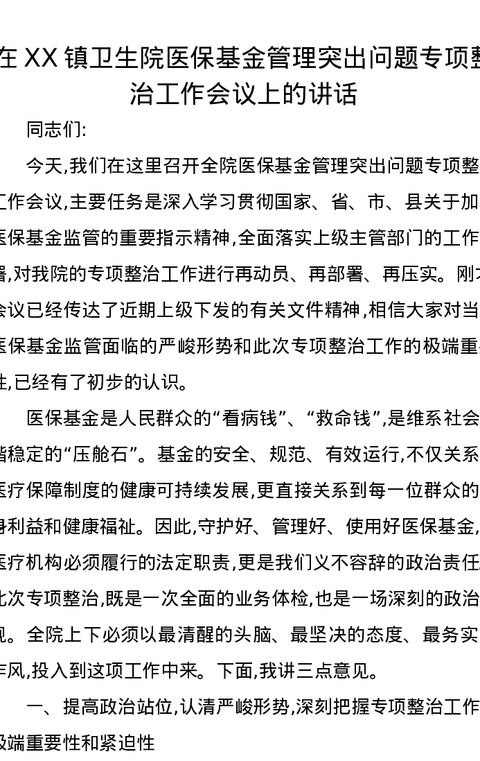 在XX镇卫生院医保基金管理突出问题专项整治工作会议上的讲话