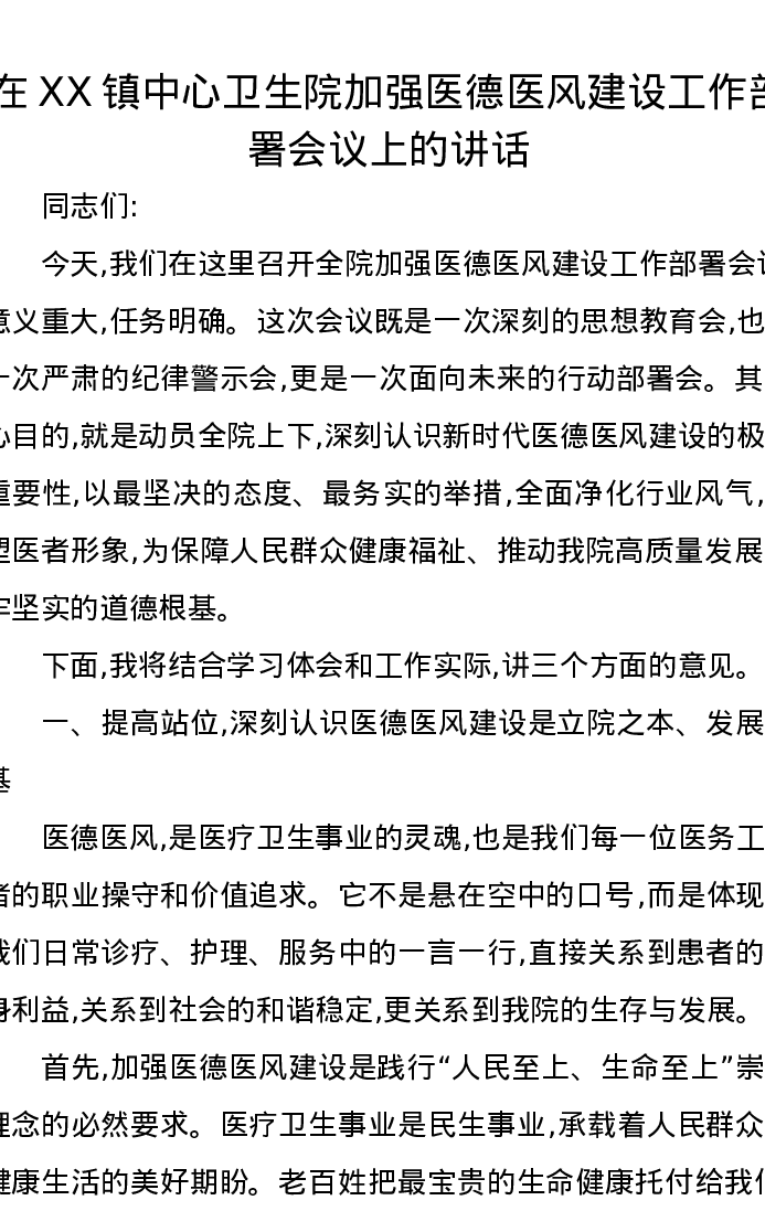 在XX镇中心卫生院加强医德医风建设工作部署会议上的讲话