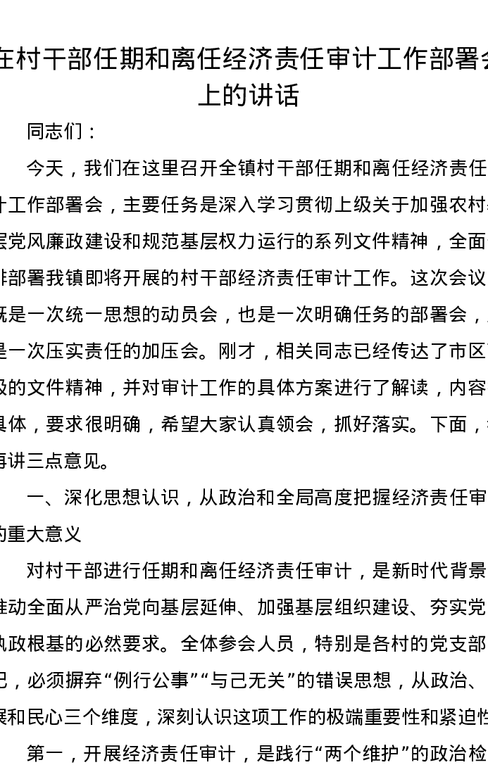 在村干部任期和离任经济责任审计工作部署会上的讲话