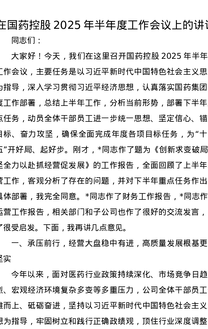 在国药控股2025年半年度工作会议上的讲话