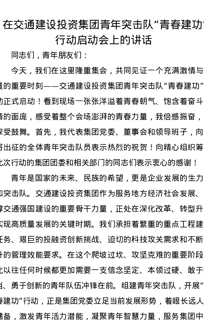 在交通建设投资集团青年突击队“青春建功”行动启动会上的讲话