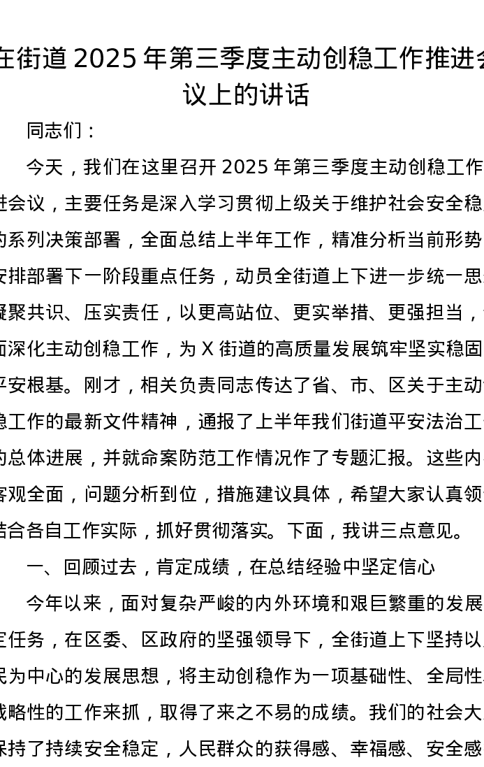 在街道2025年第三季度主动创稳工作推进会议上的讲话