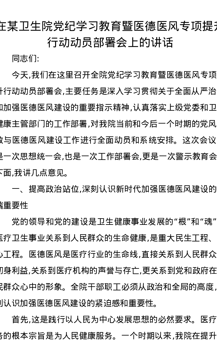 在某卫生院党纪学习教育暨医德医风专项提升行动动员部署会上的讲话