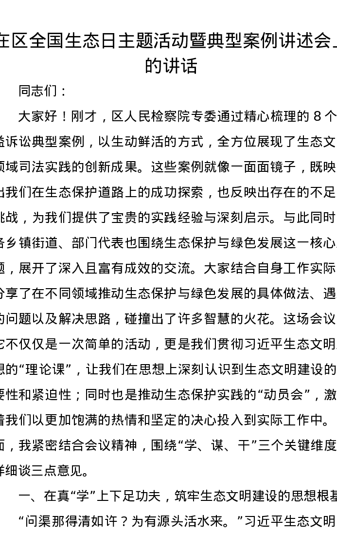 在区全国生态日主题活动暨典型案例讲述会上的讲话