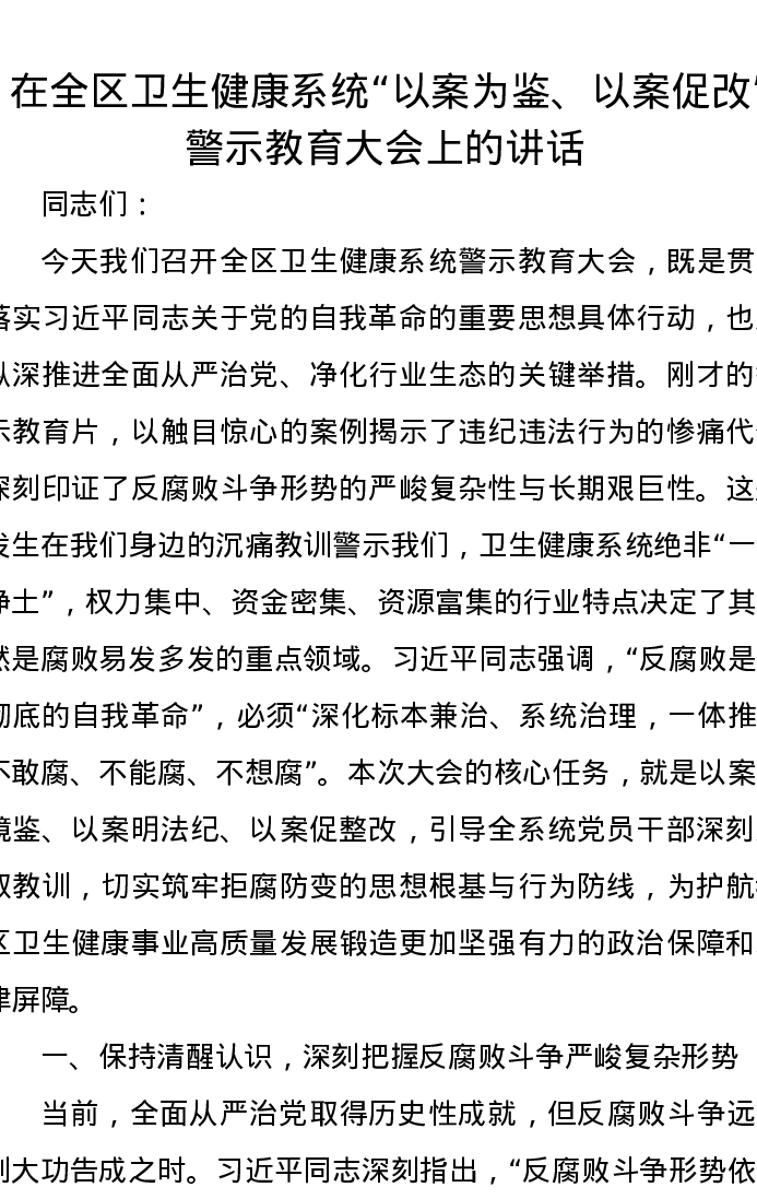 在全区卫生健康系统“以案为鉴、以案促改”警示教育大会上的讲话