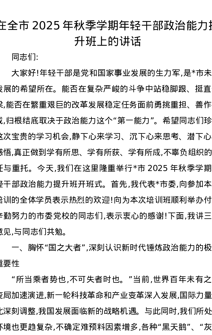 在全市2025年秋季学期年轻干部政治能力提升班上的讲话