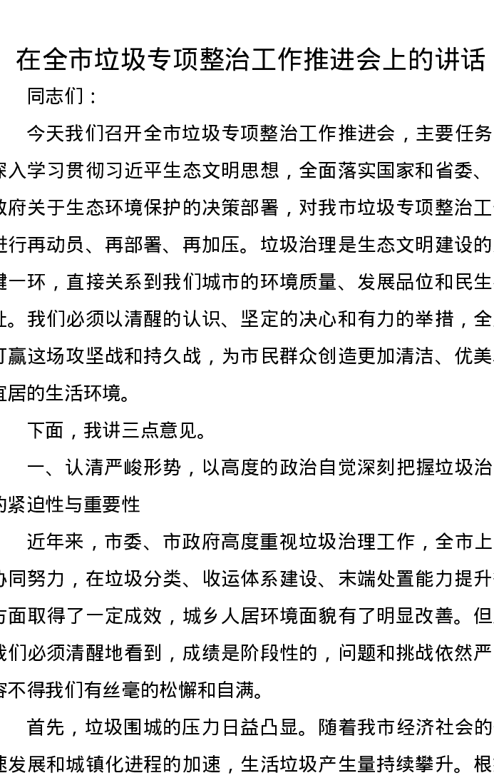 在全市垃圾专项整治工作推进会上的讲话