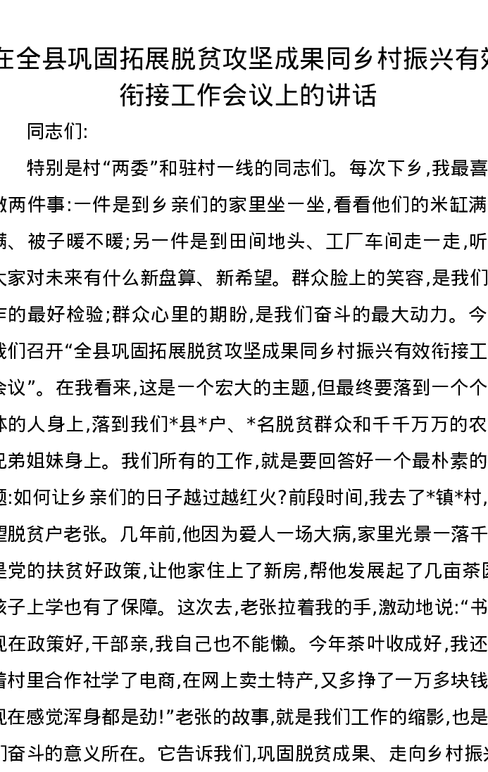 在全县巩固拓展脱贫攻坚成果同乡村振兴有效衔接工作会议上的讲话