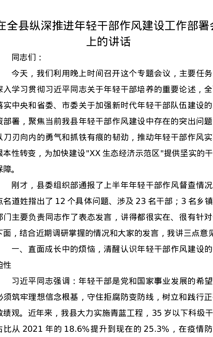 在全县纵深推进年轻干部作风建设工作部署会上的讲话
