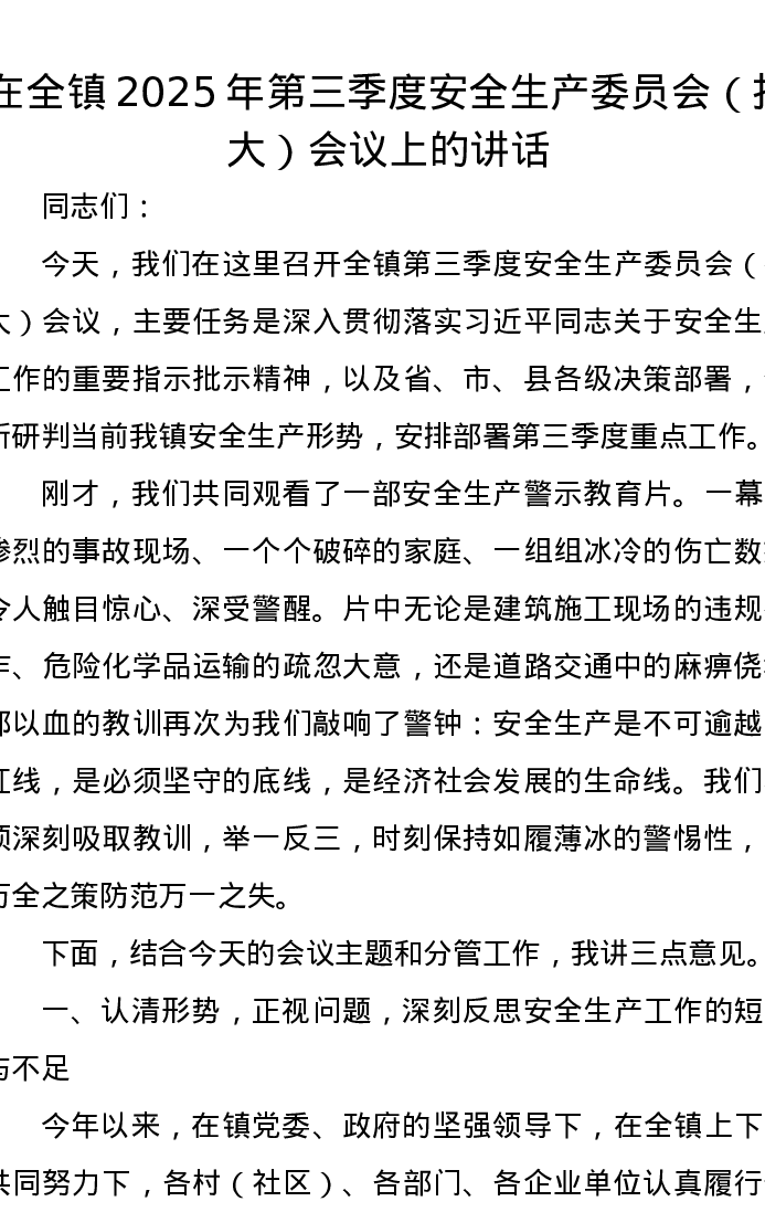 在全镇2025年第三季度安全生产委员会(扩大)会议上的讲话