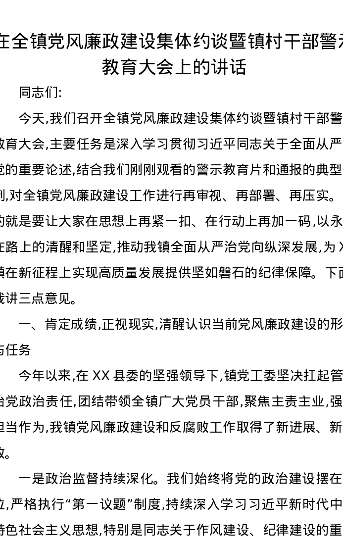 在全镇党风廉政建设集体约谈暨镇村干部警示教育大会上的讲话