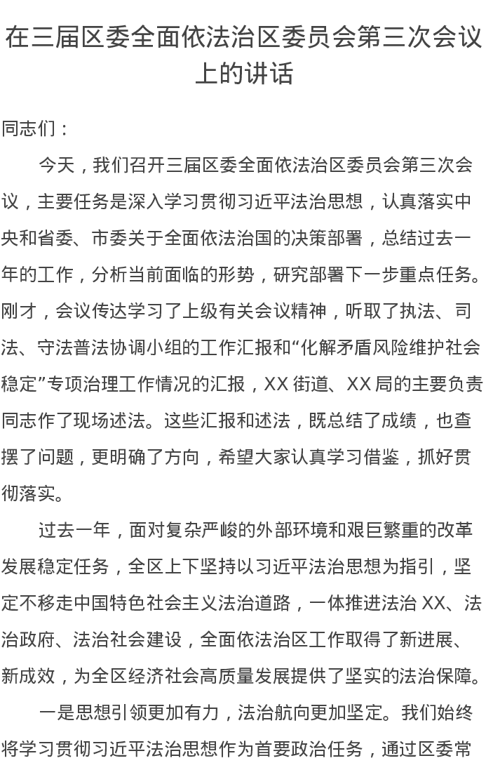 在三届区委全面依法治区委员会第三次会议上的讲话
