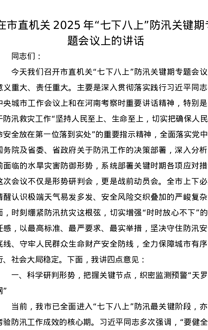 在市直机关2025年“七下八上”防汛关键期专题会议上的讲话