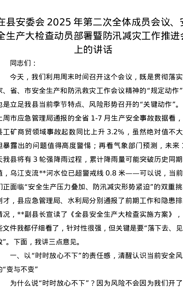 在县安委会2025年第二次全体成员会议、安全生产大检查动员部署暨防汛减灾工作推进会上的讲话