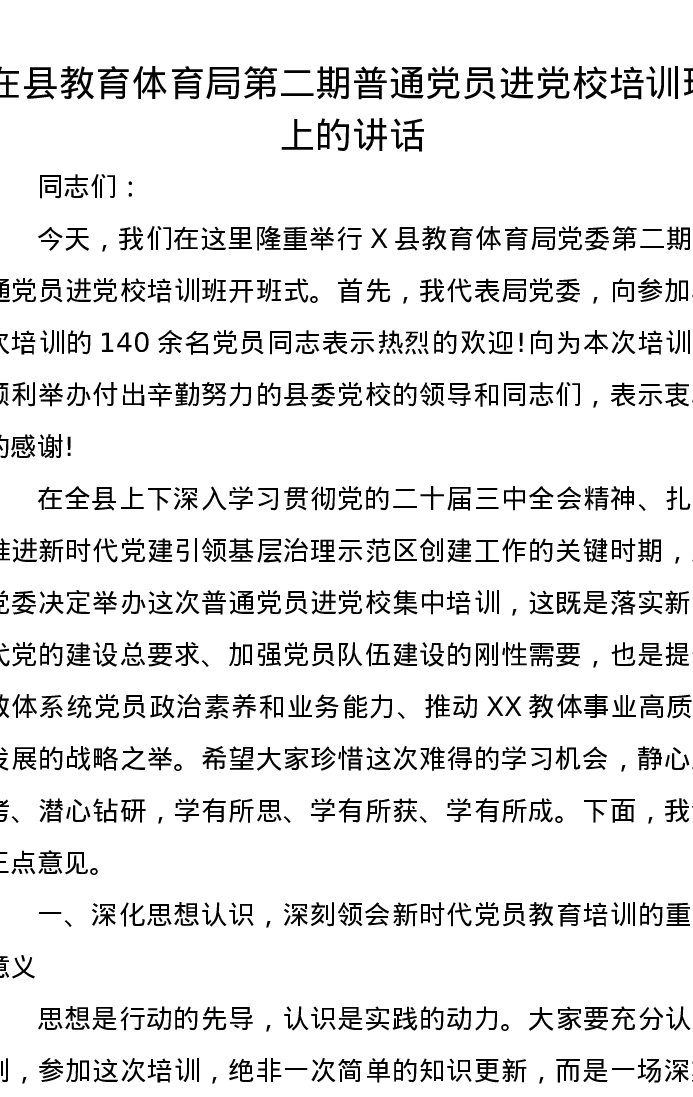 在县教育体育局第二期普通党员进党校培训班上的讲话