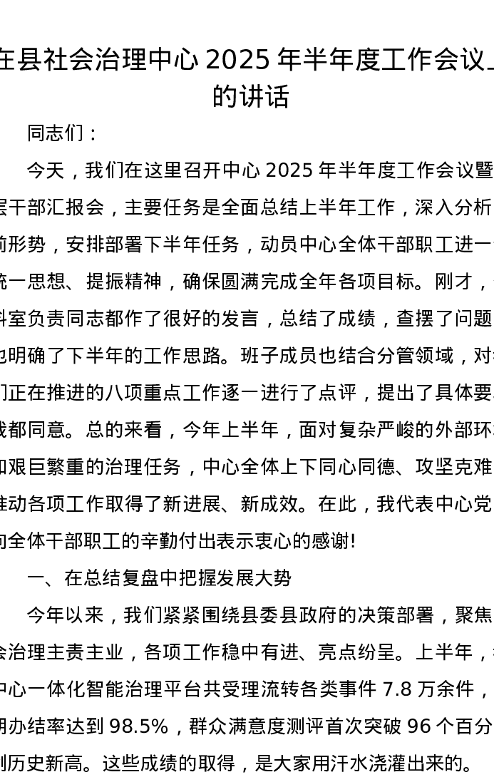 在县社会治理中心2025年半年度工作会议上的讲话
