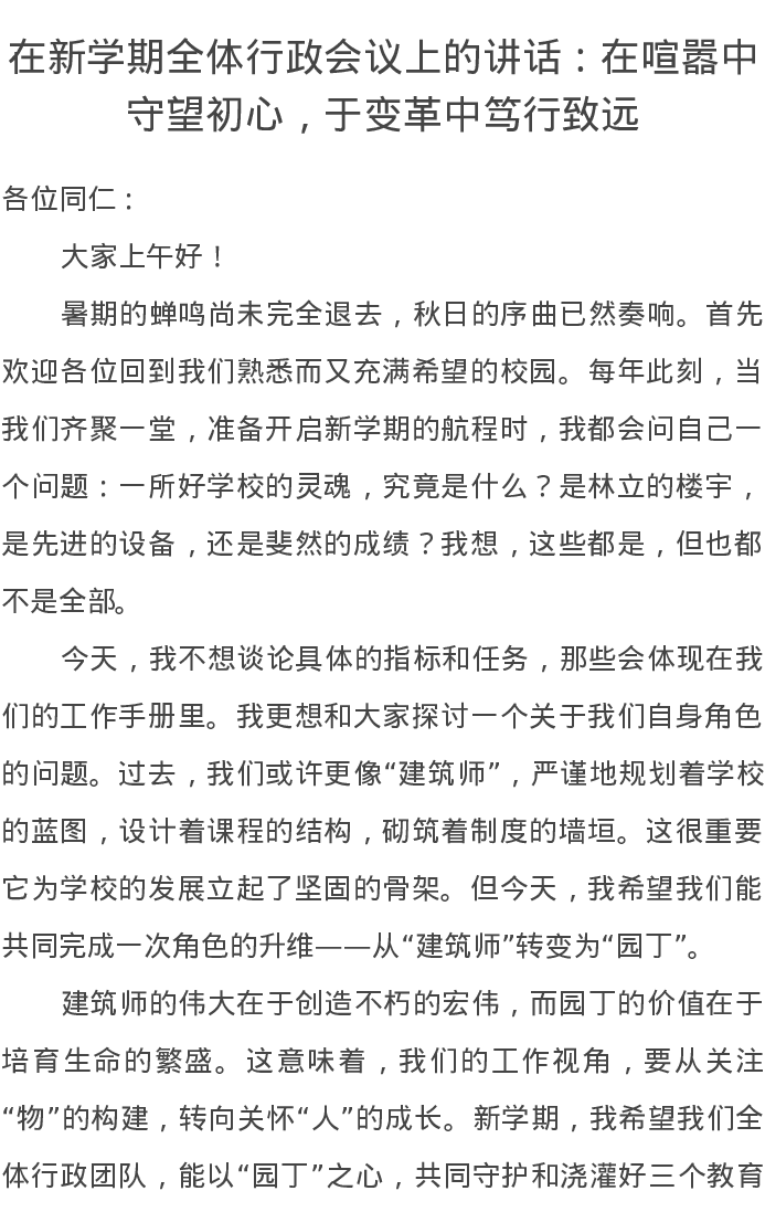 在新学期全体行政会议上的讲话:在喧嚣中守望初心,于变革中笃行致远