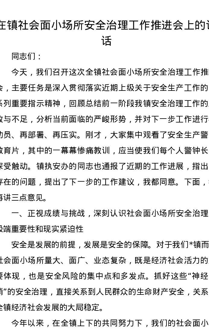 在镇社会面小场所安全治理工作推进会上的讲话
