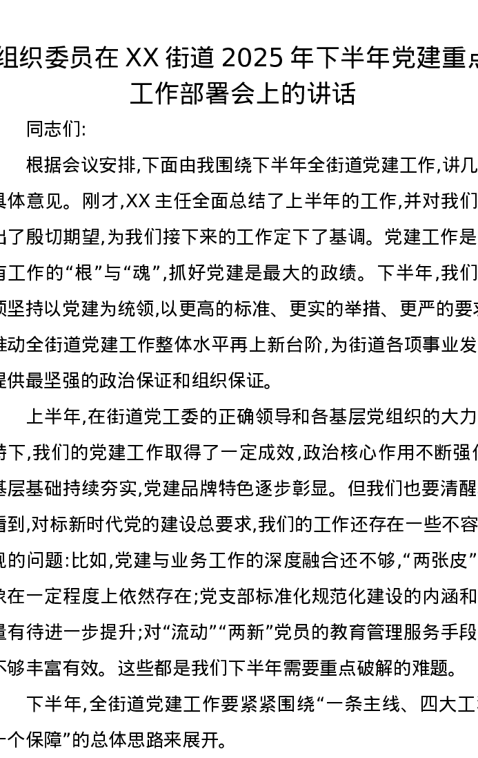 组织委员在XX街道2025年下半年党建重点工作部署会上的讲话