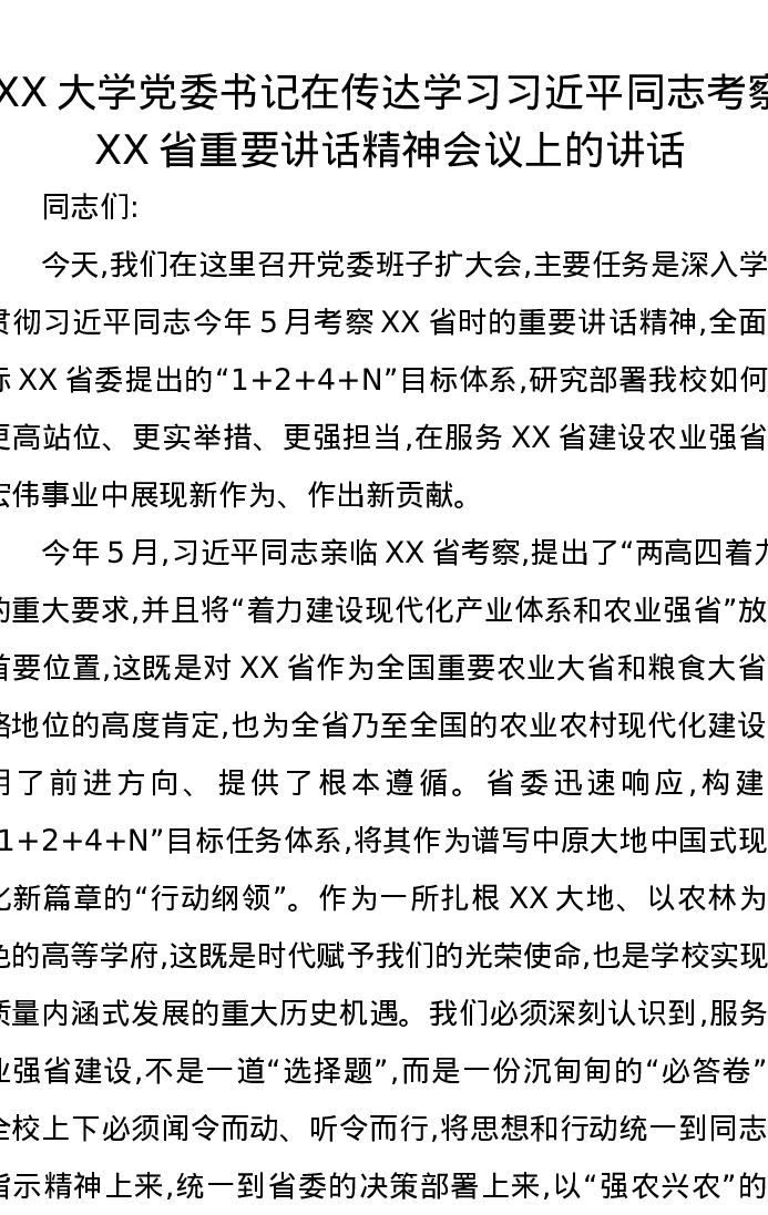 XX大学党委书记在传达学习习近平总书记考察XX省重要讲话精神会议上的讲话