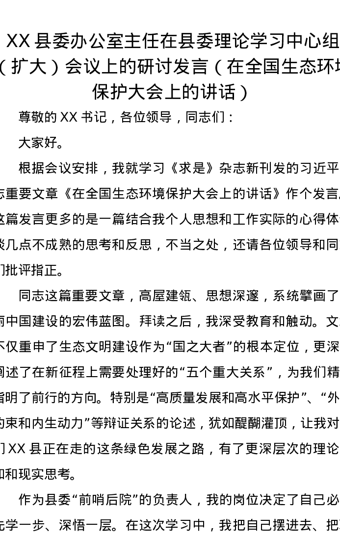 XX县委办公室主任在县委理论学习中心组(扩大)会议上的研讨发言(在全国生态环境保护大会上的讲话)