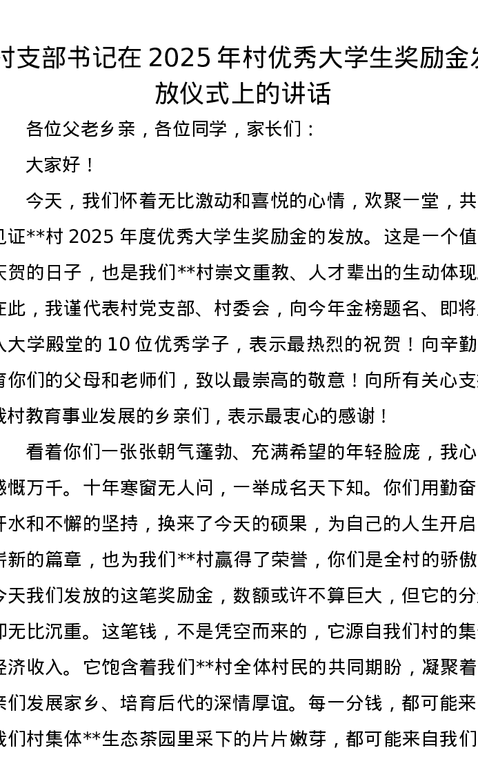 村支部书记在2025年村优秀大学生奖励金发放仪式上的讲话