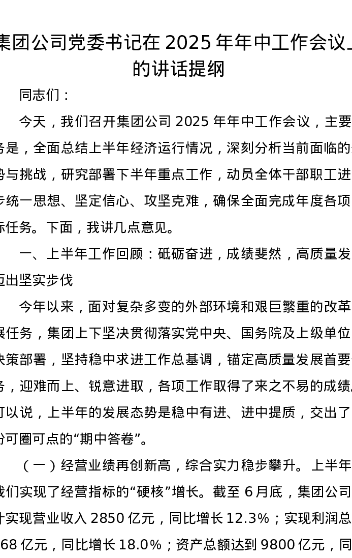 集团公司党委书记在2025年年中工作会议上的讲话提纲