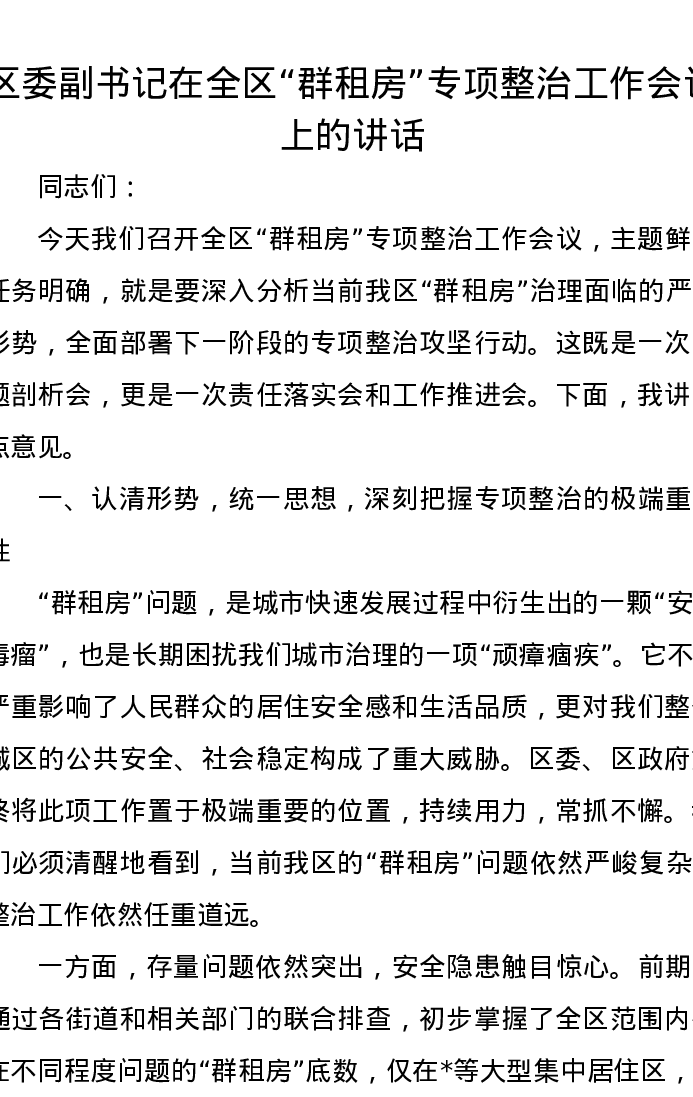 区委副书记在全区“群租房”专项整治工作会议上的讲话