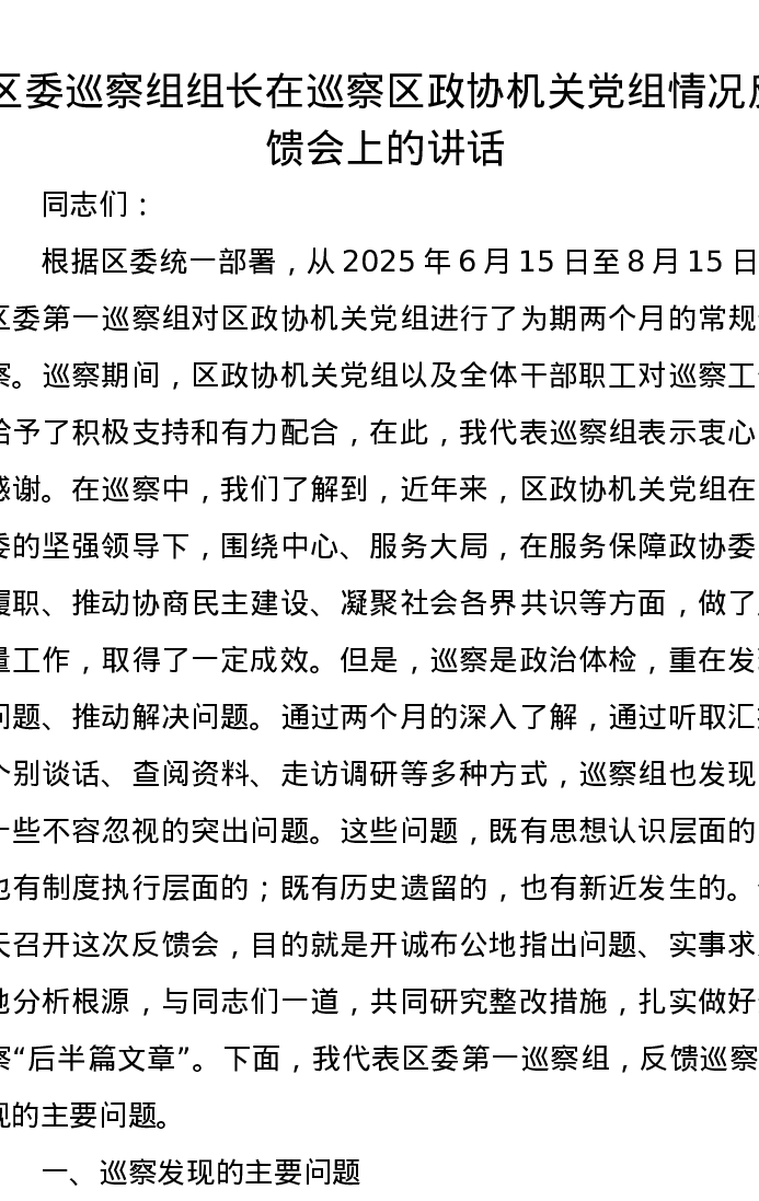 区委巡察组组长在巡察区政协机关党组情况反馈会上的讲话