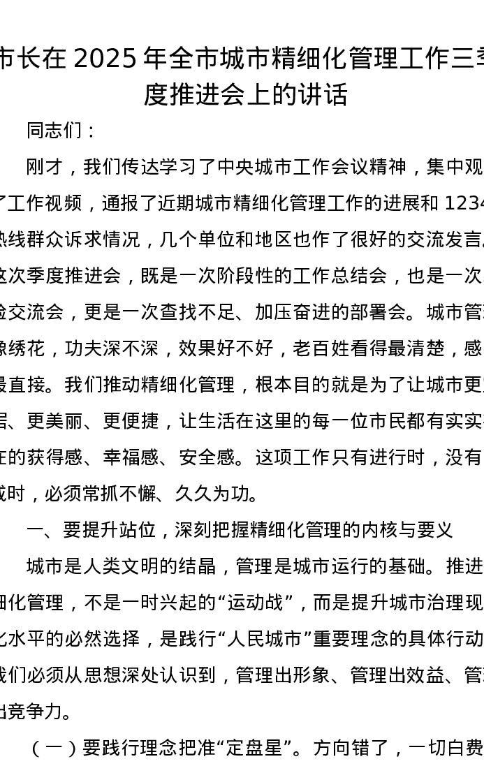 市长在2025年全市城市精细化管理工作三季度推进会上的讲话