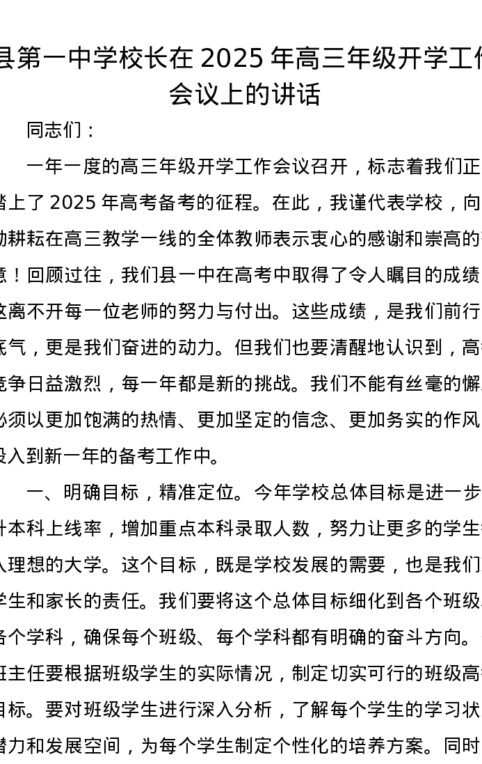 县第一中学校长在2025年高三年级开学工作会议上的讲话