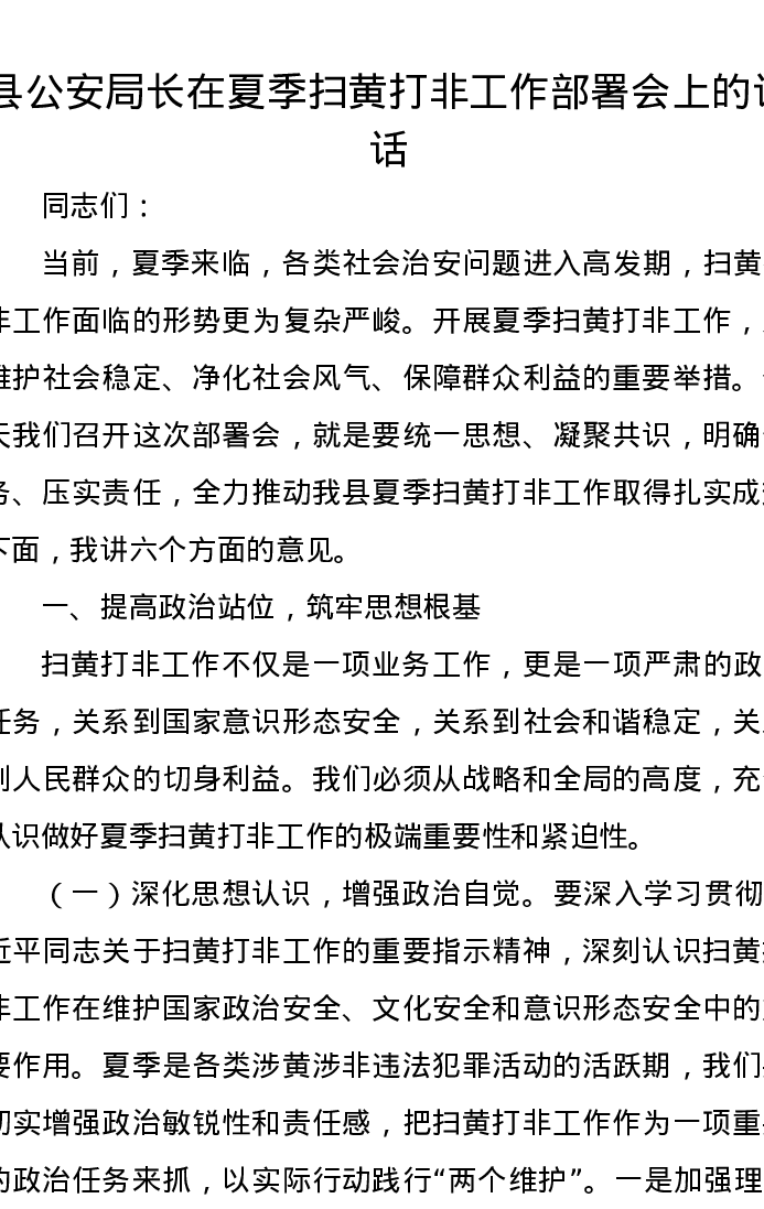 县公安局长在夏季扫黄打非工作部署会上的讲话