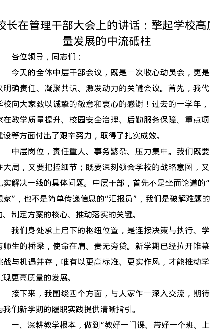 校长在管理干部大会上的讲话:擎起学校高质量发展的中流砥柱