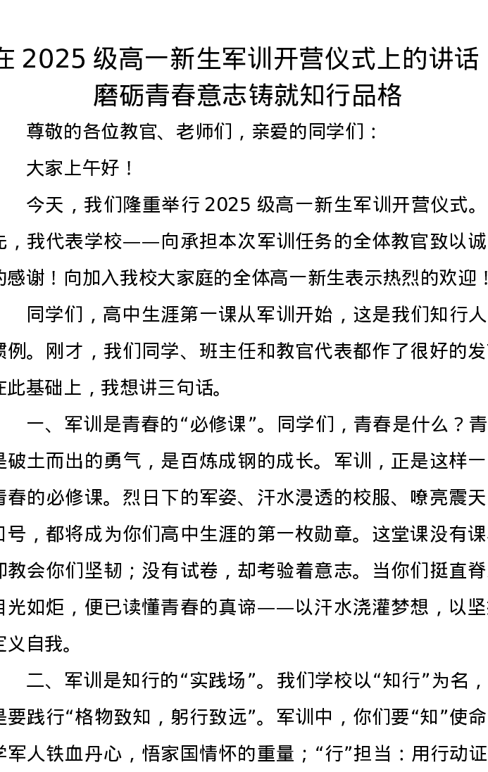 在2025级高一新生军训开营仪式上的讲话:磨砺青春意志铸就知行品格