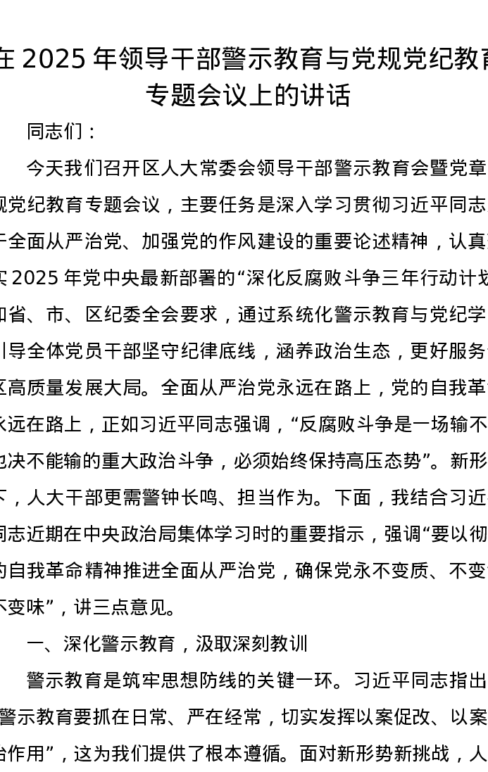 在2025年领导干部警示教育与党规党纪教育专题会议上的讲话