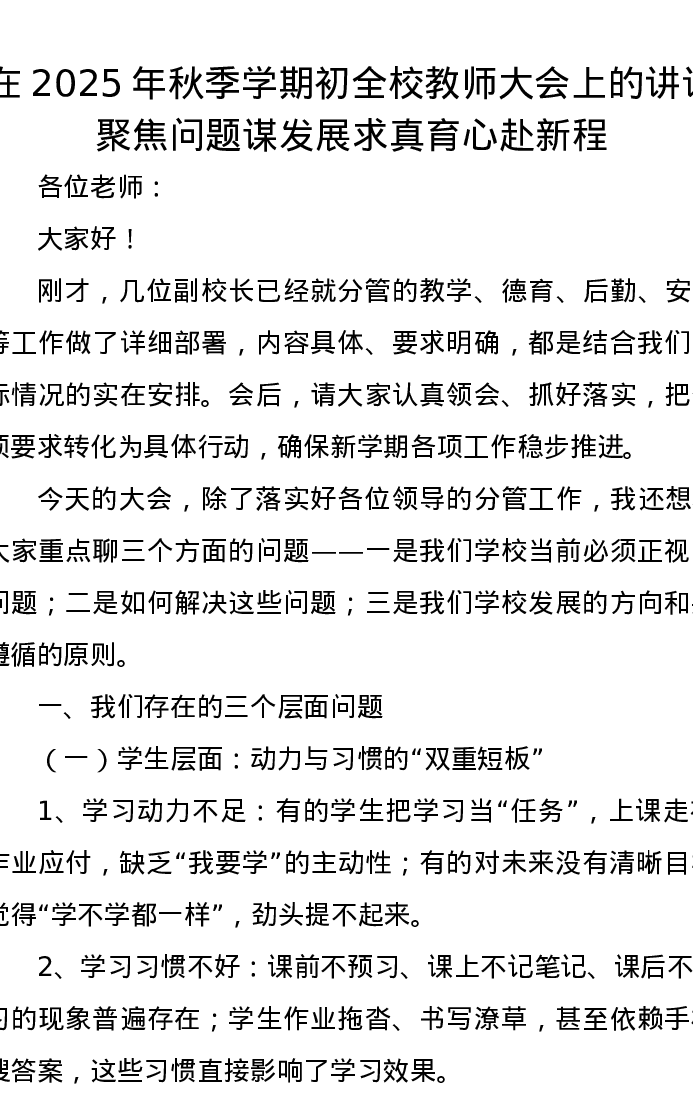 在2025年秋季学期初全校教师大会上的讲话:聚焦问题谋发展求真育心赴新程