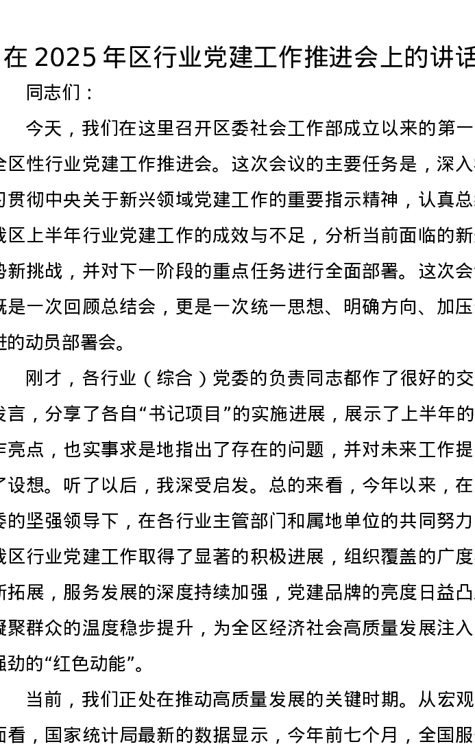 在2025年区行业党建工作推进会上的讲话
