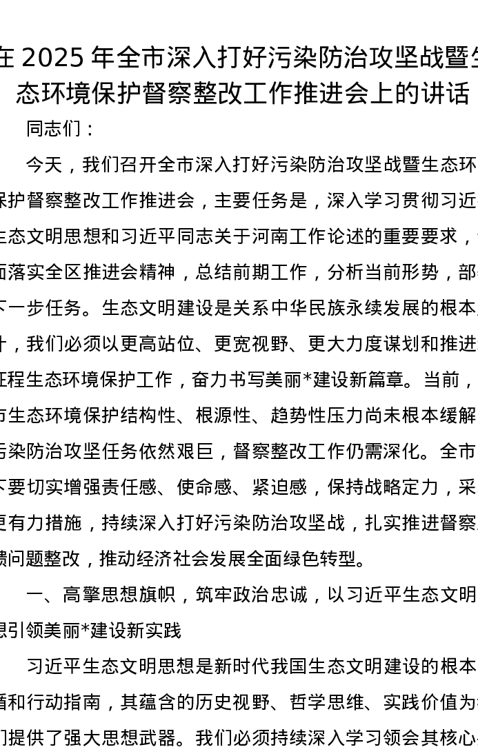 在2025年全市深入打好污染防治攻坚战暨生态环境保护督察整改工作推进会上的讲话