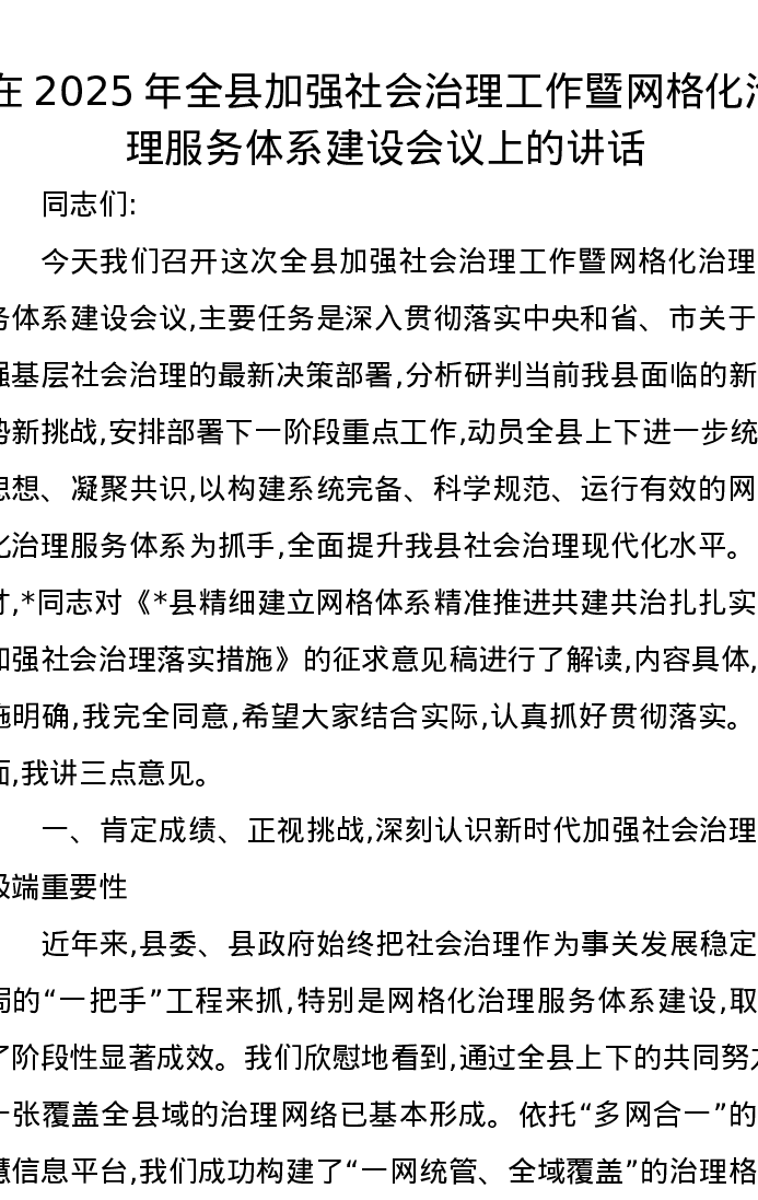 在2025年全县加强社会治理工作暨网格化治理服务体系建设会议上的讲话
