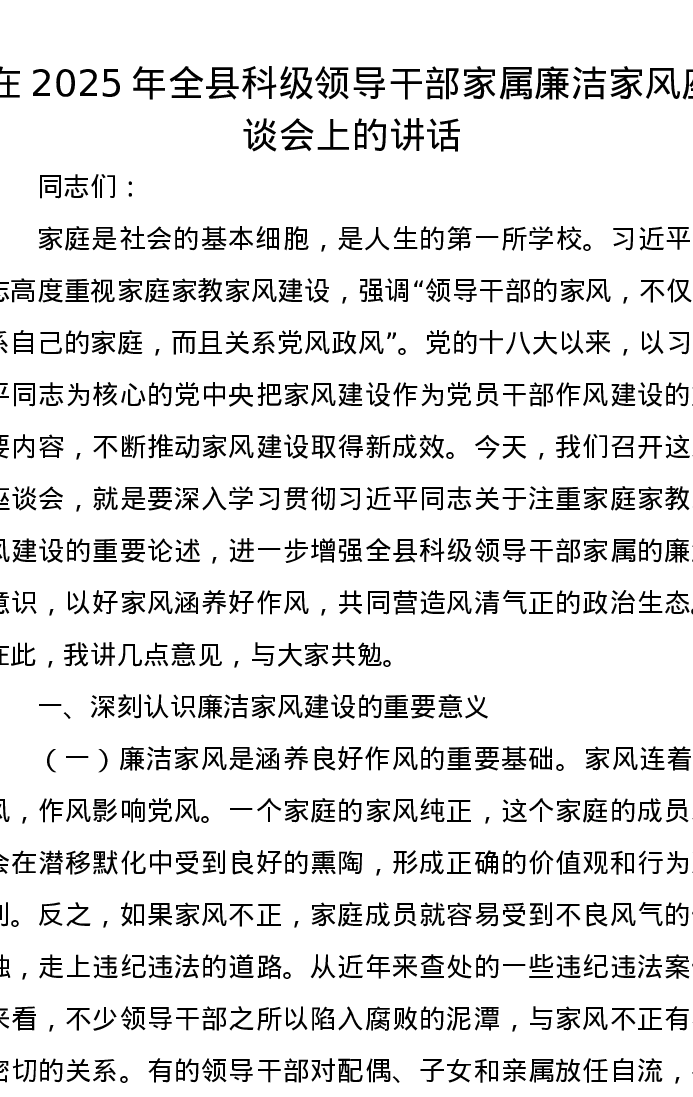 在2025年全县科级领导干部家属廉洁家风座谈会上的讲话